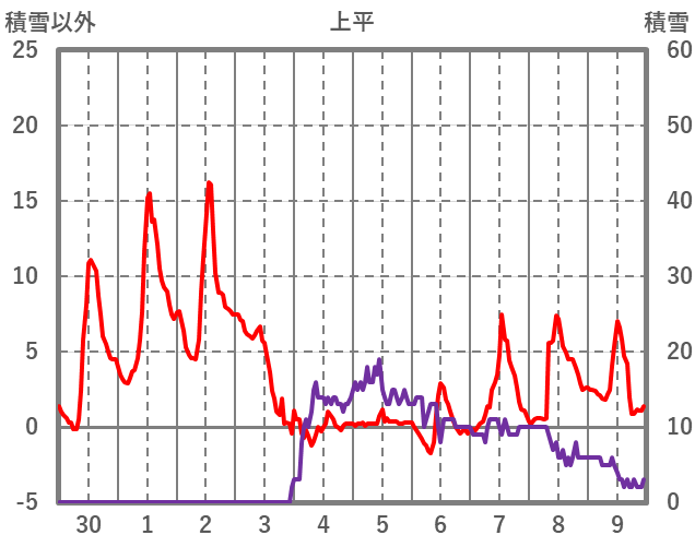 | 日 | 時 | 気温 | 降水 | 風向/風速 | 日照 | 積雪 | 降雪 |