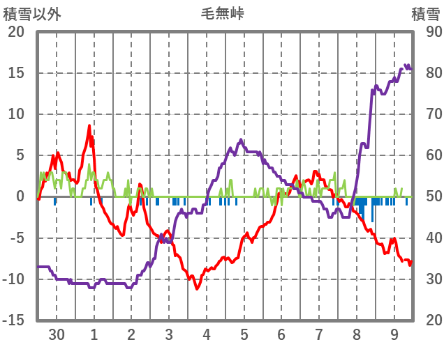 | 日 | 時 | 気温 | 降水 | 風向/風速 | 日照 | 積雪 | 降雪 |