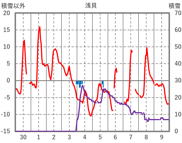 | 日 | 時 | 気温 | 降水 | 風向/風速 | 日照 | 積雪 | 降雪 |