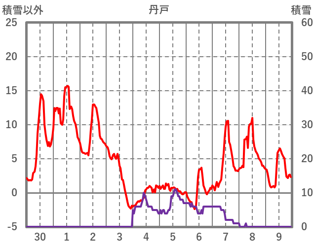 | 日 | 時 | 気温 | 降水 | 風向/風速 | 日照 | 積雪 | 降雪 |