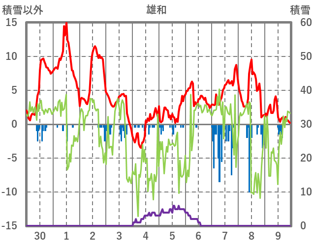 | 日 | 時 | 気温 | 降水 | 風向/風速 | 日照 | 積雪 | 降雪 |