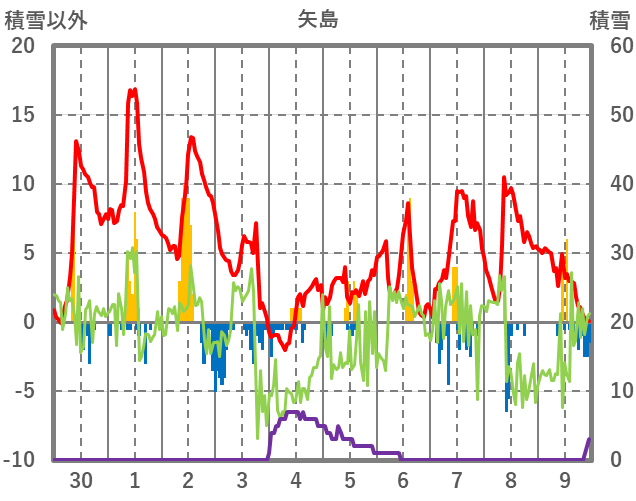 | 日 | 時 | 気温 | 降水 | 風向/風速 | 日照 | 積雪 | 降雪 |