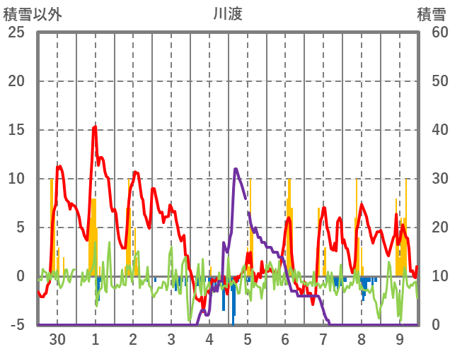 | 日 | 時 | 気温 | 降水 | 風向/風速 | 日照 | 積雪 | 降雪 |