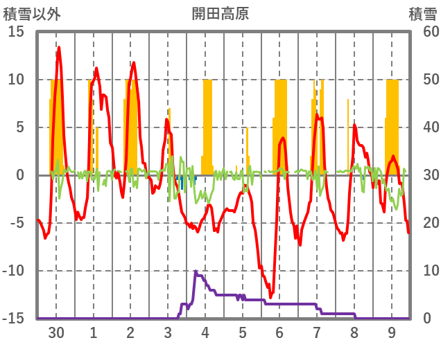 | 日 | 時 | 気温 | 降水 | 風向/風速 | 日照 | 積雪 | 降雪 |