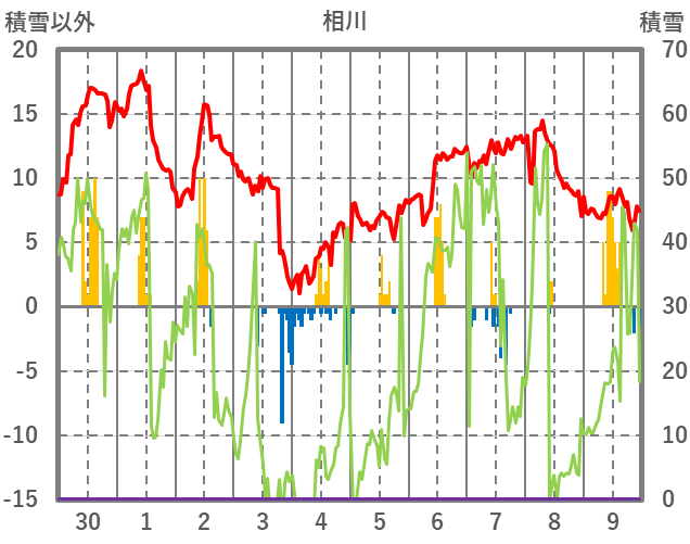 | 日 | 時 | 気温 | 降水 | 風向/風速 | 日照 | 積雪 | 降雪 |