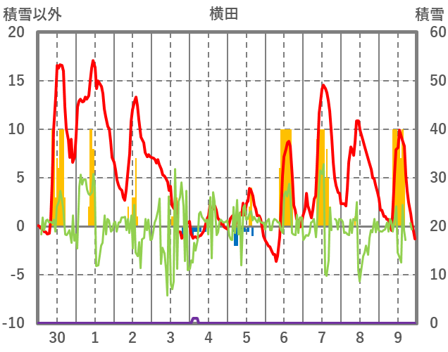 | 日 | 時 | 気温 | 降水 | 風向/風速 | 日照 | 積雪 | 降雪 |