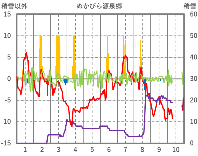 | 日 | 時 | 気温 | 降水 | 風向/風速 | 日照 | 積雪 | 降雪 |