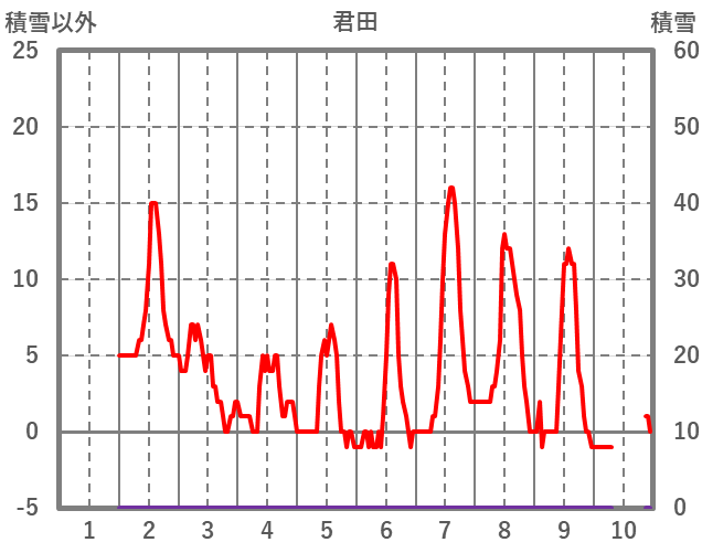 | 日 | 時 | 気温 | 降水 | 風向/風速 | 日照 | 積雪 | 降雪 |