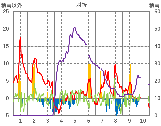 | 日 | 時 | 気温 | 降水 | 風向/風速 | 日照 | 積雪 | 降雪 |