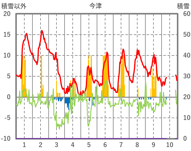 | 日 | 時 | 気温 | 降水 | 風向/風速 | 日照 | 積雪 | 降雪 |