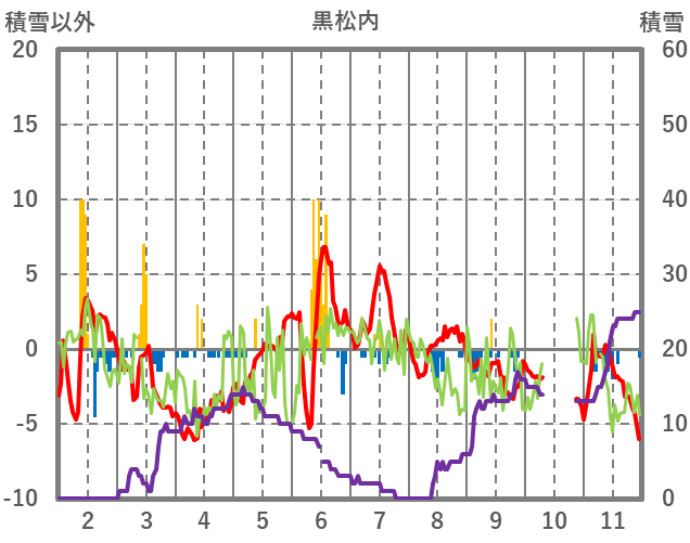 | 日 | 時 | 気温 | 降水 | 風向/風速 | 日照 | 積雪 | 降雪 |