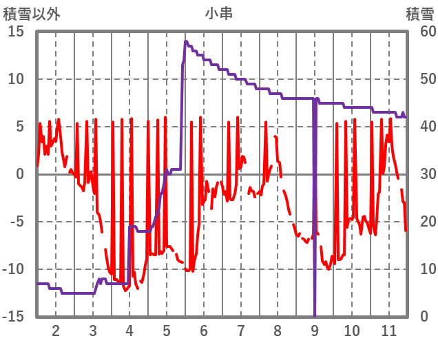 | 日 | 時 | 気温 | 降水 | 風向/風速 | 日照 | 積雪 | 降雪 |