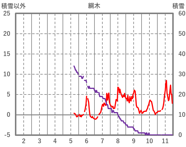 | 日 | 時 | 気温 | 降水 | 風向/風速 | 日照 | 積雪 | 降雪 |