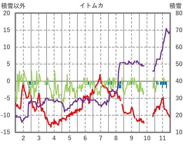 | 日 | 時 | 気温 | 降水 | 風向/風速 | 日照 | 積雪 | 降雪 |