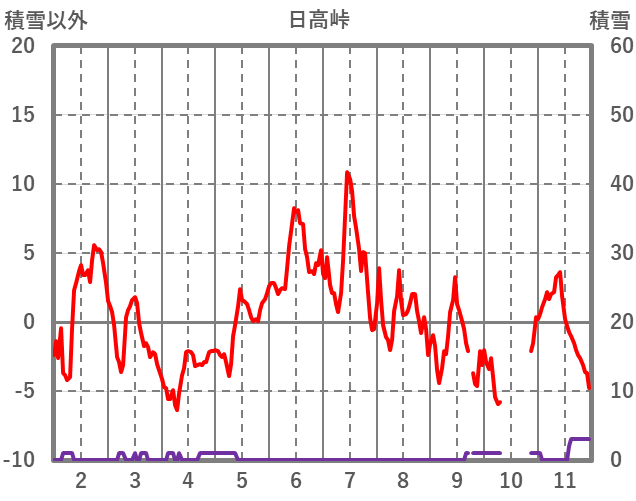 | 日 | 時 | 気温 | 降水 | 風向/風速 | 日照 | 積雪 | 降雪 |