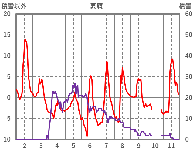 | 日 | 時 | 気温 | 降水 | 風向/風速 | 日照 | 積雪 | 降雪 |