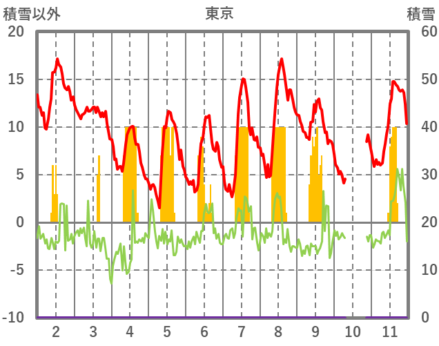 | 日 | 時 | 気温 | 降水 | 風向/風速 | 日照 | 積雪 | 降雪 |