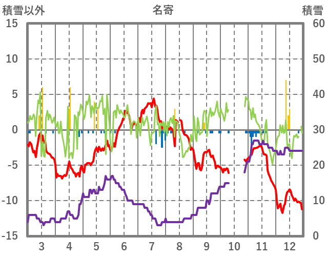 | 日 | 時 | 気温 | 降水 | 風向/風速 | 日照 | 積雪 | 降雪 |