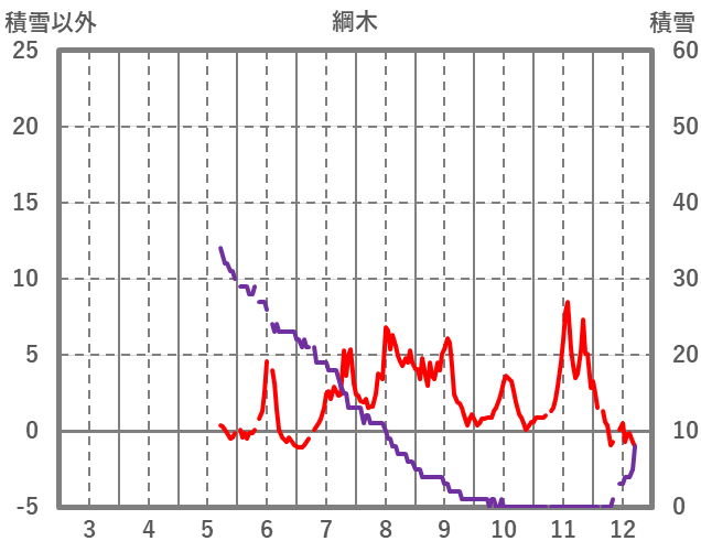 | 日 | 時 | 気温 | 降水 | 風向/風速 | 日照 | 積雪 | 降雪 |