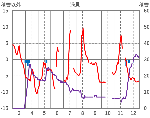 | 日 | 時 | 気温 | 降水 | 風向/風速 | 日照 | 積雪 | 降雪 |