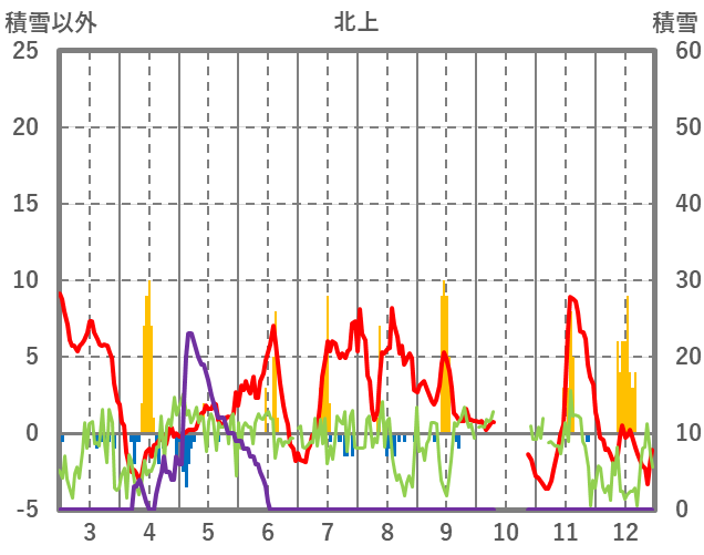 | 日 | 時 | 気温 | 降水 | 風向/風速 | 日照 | 積雪 | 降雪 |
