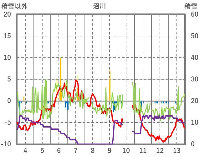 | 日 | 時 | 気温 | 降水 | 風向/風速 | 日照 | 積雪 | 降雪 |