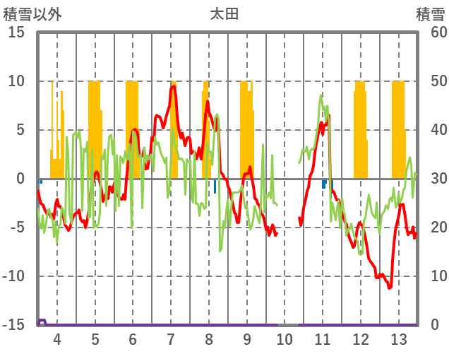| 日 | 時 | 気温 | 降水 | 風向/風速 | 日照 | 積雪 | 降雪 |