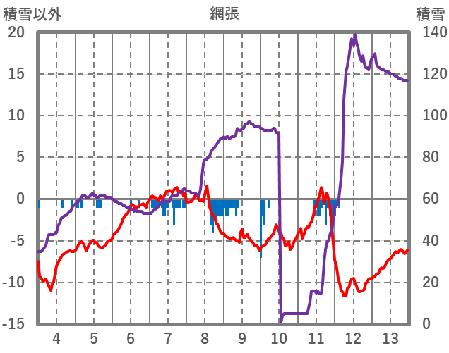 | 日 | 時 | 気温 | 降水 | 風向/風速 | 日照 | 積雪 | 降雪 |