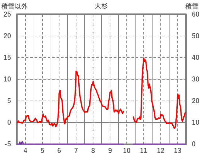 | 日 | 時 | 気温 | 降水 | 風向/風速 | 日照 | 積雪 | 降雪 |