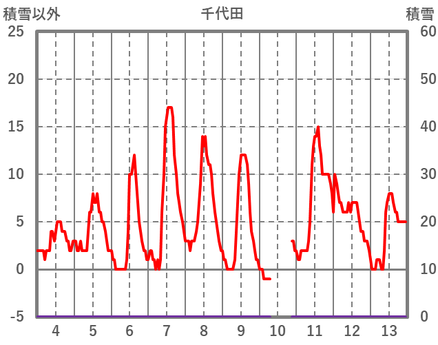 | 日 | 時 | 気温 | 降水 | 風向/風速 | 日照 | 積雪 | 降雪 |