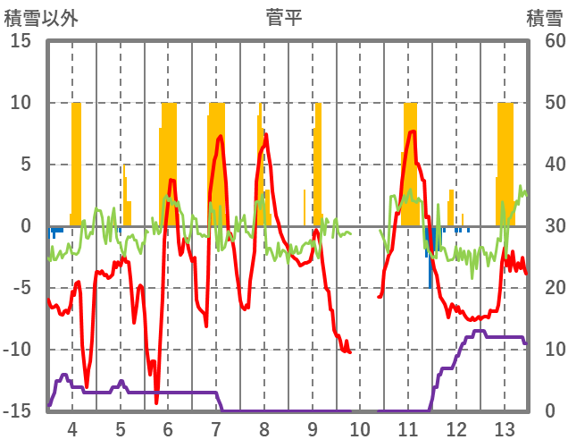 | 日 | 時 | 気温 | 降水 | 風向/風速 | 日照 | 積雪 | 降雪 |