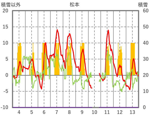 | 日 | 時 | 気温 | 降水 | 風向/風速 | 日照 | 積雪 | 降雪 |