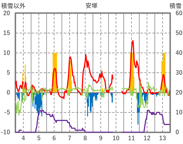 | 日 | 時 | 気温 | 降水 | 風向/風速 | 日照 | 積雪 | 降雪 |