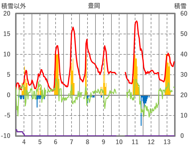 | 日 | 時 | 気温 | 降水 | 風向/風速 | 日照 | 積雪 | 降雪 |
