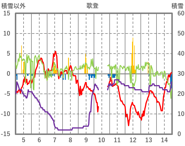 | 日 | 時 | 気温 | 降水 | 風向/風速 | 日照 | 積雪 | 降雪 |