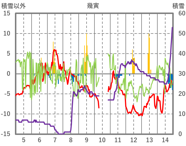 | 日 | 時 | 気温 | 降水 | 風向/風速 | 日照 | 積雪 | 降雪 |