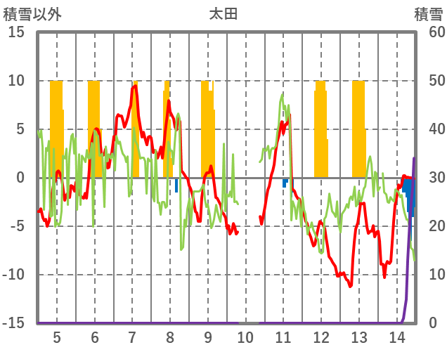 | 日 | 時 | 気温 | 降水 | 風向/風速 | 日照 | 積雪 | 降雪 |