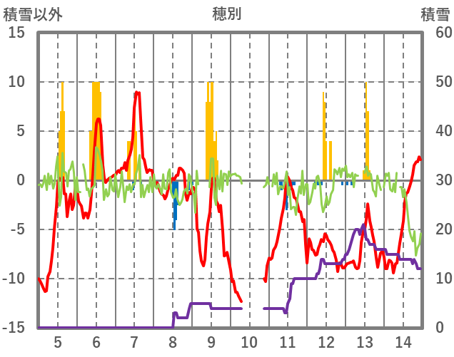 | 日 | 時 | 気温 | 降水 | 風向/風速 | 日照 | 積雪 | 降雪 |