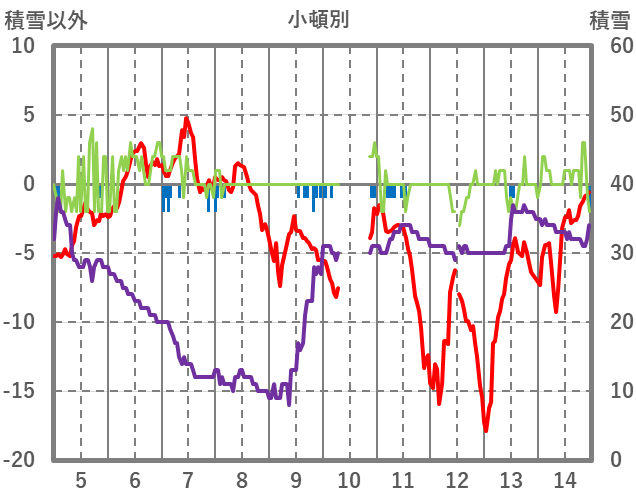 | 日 | 時 | 気温 | 降水 | 風向/風速 | 日照 | 積雪 | 降雪 |
