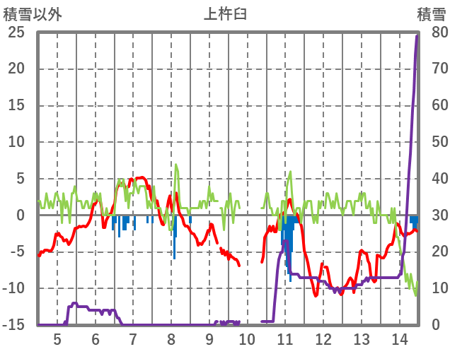 | 日 | 時 | 気温 | 降水 | 風向/風速 | 日照 | 積雪 | 降雪 |