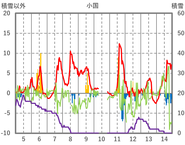 | 日 | 時 | 気温 | 降水 | 風向/風速 | 日照 | 積雪 | 降雪 |