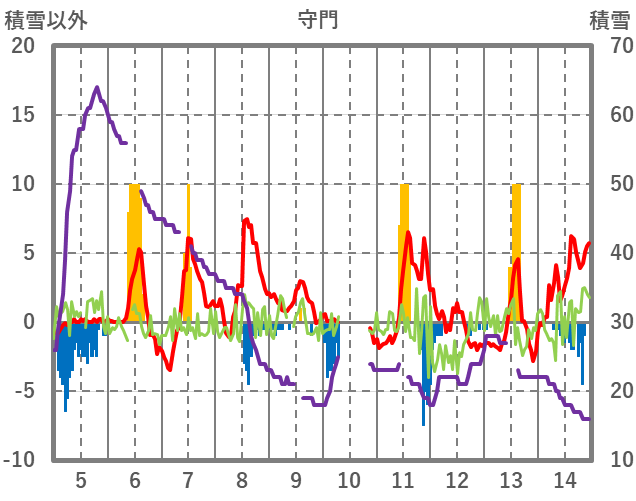 | 日 | 時 | 気温 | 降水 | 風向/風速 | 日照 | 積雪 | 降雪 |