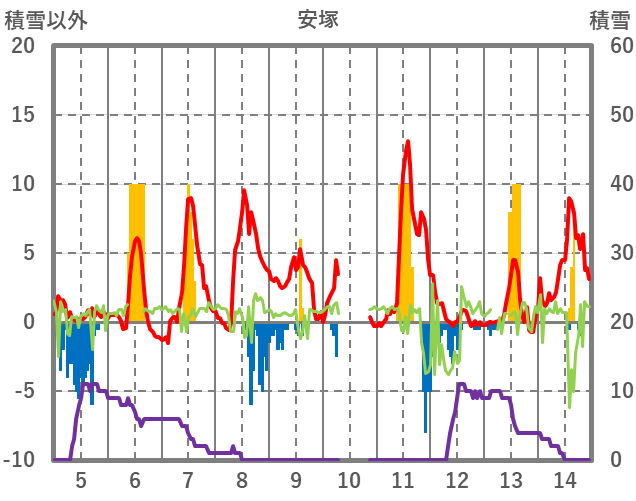 | 日 | 時 | 気温 | 降水 | 風向/風速 | 日照 | 積雪 | 降雪 |
