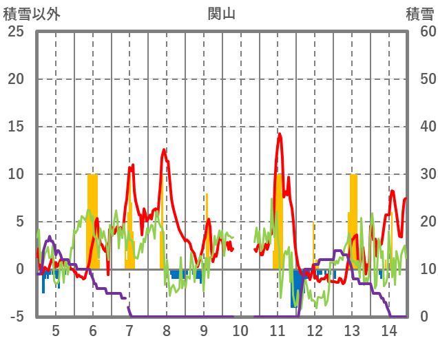 | 日 | 時 | 気温 | 降水 | 風向/風速 | 日照 | 積雪 | 降雪 |