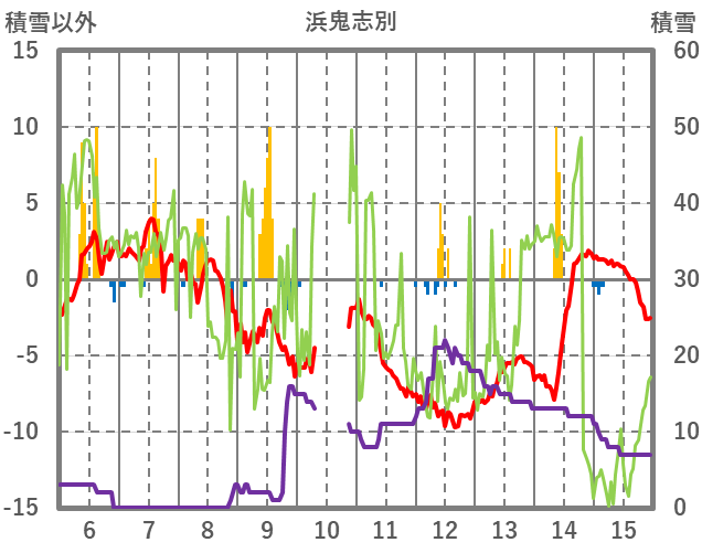 | 日 | 時 | 気温 | 降水 | 風向/風速 | 日照 | 積雪 | 降雪 |