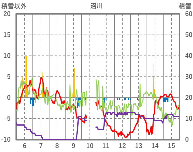 | 日 | 時 | 気温 | 降水 | 風向/風速 | 日照 | 積雪 | 降雪 |