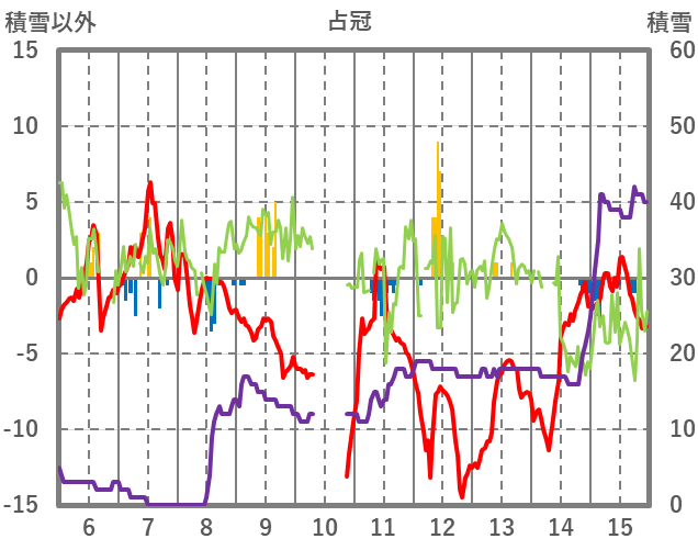 | 日 | 時 | 気温 | 降水 | 風向/風速 | 日照 | 積雪 | 降雪 |