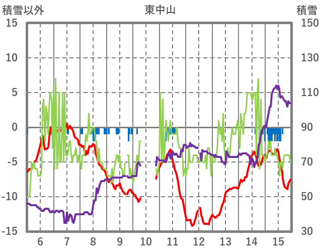 | 日 | 時 | 気温 | 降水 | 風向/風速 | 日照 | 積雪 | 降雪 |