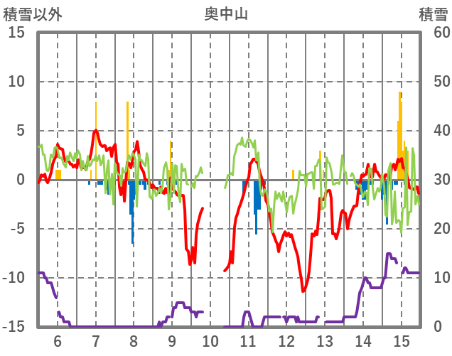 | 日 | 時 | 気温 | 降水 | 風向/風速 | 日照 | 積雪 | 降雪 |