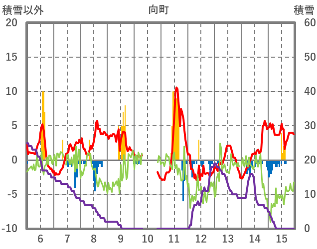 | 日 | 時 | 気温 | 降水 | 風向/風速 | 日照 | 積雪 | 降雪 |